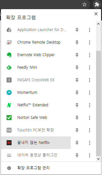 1. 크롬 주소창 옆에 있는 퍼즐 모양의 확장 프로그램 칸에서 '끝내지 않는 넷플릭스'를 클릭해주세요